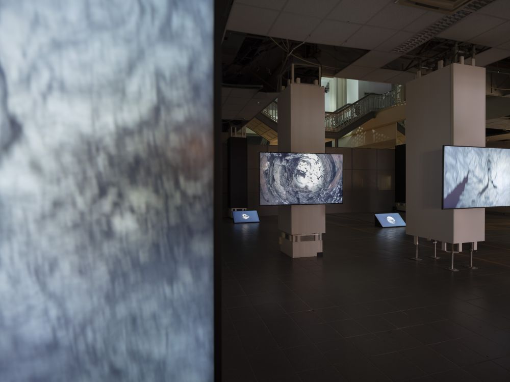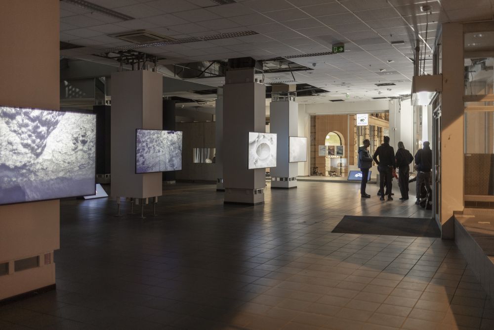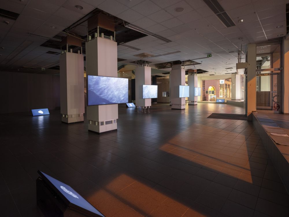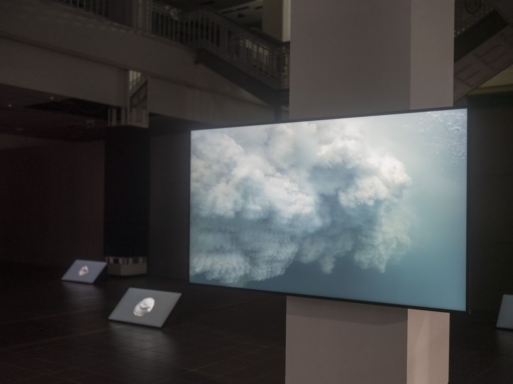 Die Videoinstallation von Florian Fischer & Johannes Krell verknüpft drei geologische und kulturelle Formationen zu einer Erzählung über Stoffkreisläufe und Zeit: den Störmthaler See, die Wimmelburger Schlotten und Fossilien aus Muschelkalk. Im Störmthaler See, einem gefluteten Tagebaurestloch, entstehen weiße Trübungen durch eine gesteuerte Kalkung: Kalziumkarbonat wird eingebracht, um Wasserqualität und pH-Wert zu stabilisieren. Von oben betrachtet erscheinen die künstlichen Kalkwolken wie ein Echo uralter Gesteinsbildung. Unter Tage zeigen die Wimmelburger Schlotten, wie Wasser Landschaft formt. Über Jahrtausende durchspülte es die Ablagerungen des Zechsteins, bis oberirdisch Täler und unterirdisch weitläufige Hohlräume entstanden. Der Tanzsaal, eine monumentale Kammer, verbindet geologischen Prozess und menschliche Nutzung. Aufnahmen von Muschelkalkfossilien verweisen auf ein Flachmeer vor 240 Millionen Jahren. Ihre Abbildungen verwandeln versteinertes Leben in Topografien und Reliefs, Karten einer geologischen Erinnerung. So treten drei Formen von Kalk in Beziehung: das künstlich eingebrachte Kalziumkarbonat im See, die vom Wasser ausgehöhlten Schlotten und die Fossilien als Zeugen einer vergangenen Zeit. Kalk erscheint nicht nur als Material, sondern als Medium: er trägt Erinnerung, markiert Brüche und legt Spuren frei, die sich in unsere Gegenwart einschreiben.