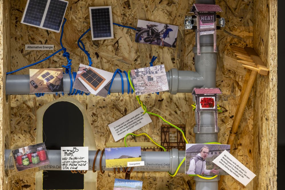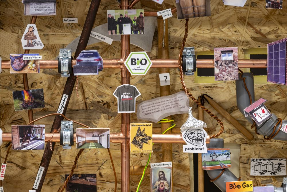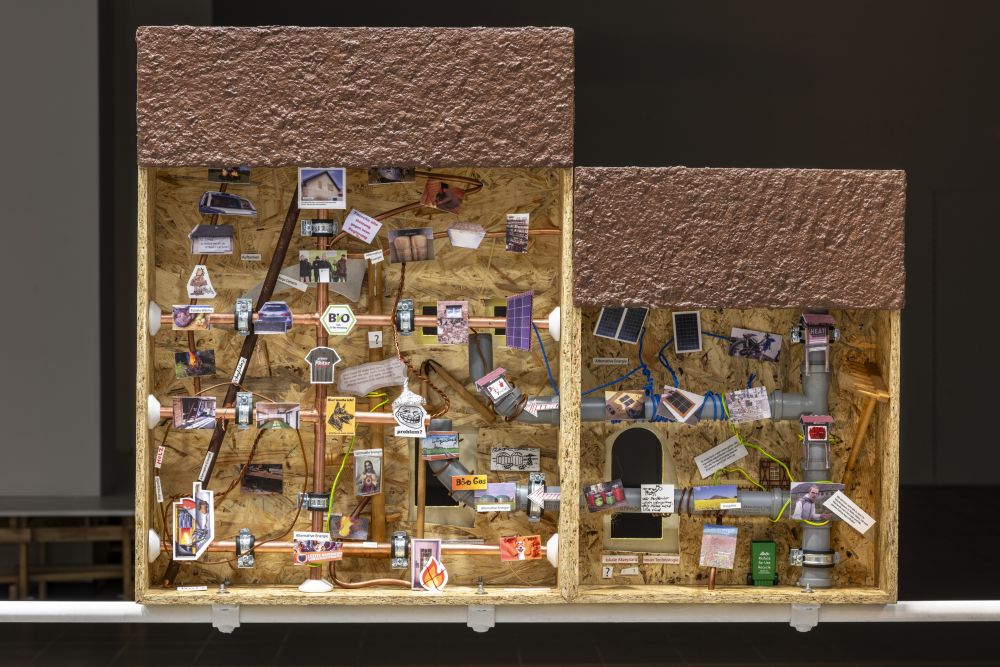 Es entsteht eine Installation, die mit Modellen von Gebäuden und Heizkreisläufen auf die Verflechtungen von sozialer und physikalischer Wärme verweist. Ob Öl- und Gasheizung, Holzofen, Wärmepumpe oder Solarenergie, Wärme führt nicht zwangsläufig zu sozialem Kitt.