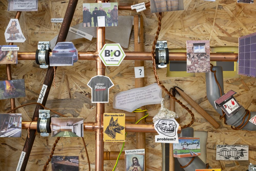 Es entsteht eine Installation, die mit Modellen von Gebäuden und Heizkreisläufen auf die Verflechtungen von sozialer und physikalischer Wärme verweist. Ob Öl- und Gasheizung, Holzofen, Wärmepumpe oder Solarenergie, Wärme führt nicht zwangsläufig zu sozialem Kitt.
