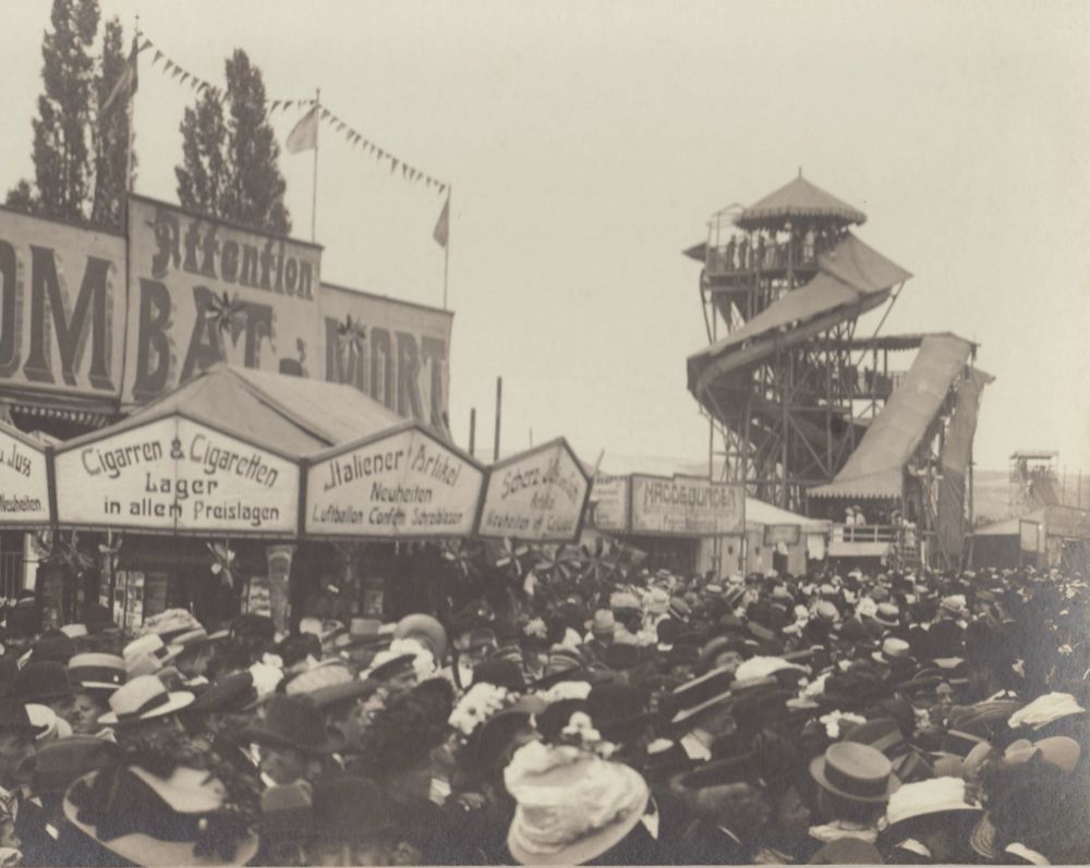 Fahrgeschäfte, Stände und Besuchende. Gefüllter Wiesenmarkt in Eisleben.