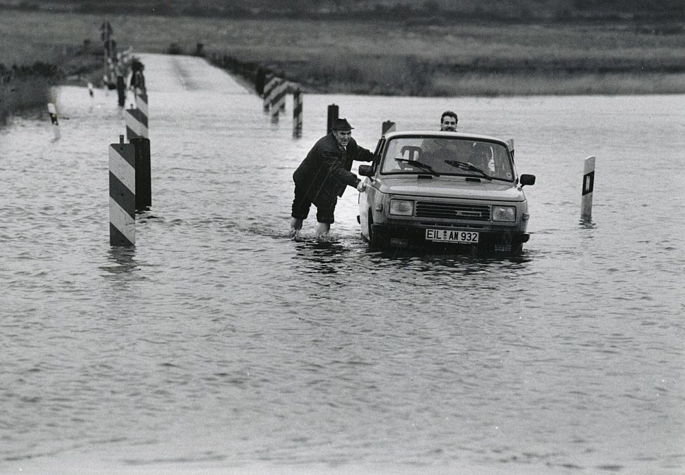Auf dem Gebiet des früheren Salzigen Sees befinden sich noch ausgebreitete Wasserflächen und teils versumpfte Röhrichtbestände innerhalb seiner alten Ufergebiete. Die Straßen in diesem Gebiet liegen oft nur knapp über dem Grundwasserhorizont. Die Große Seestraße zwischen Röblingen und Aseleben wird so bei starkem Niederschlag regelmäßig überschwemmt. © Jürgen Lukaschek, Archiv MZ